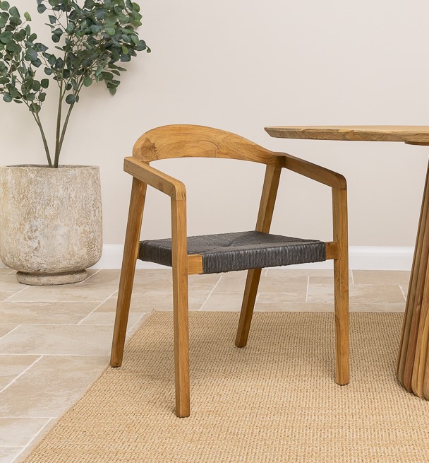 Elevate your space with timeless craftsmanship and sustainable design with this Reclaimed Teak Eclipse Chair with Black Woven Seat. Handcrafted from durable reclaimed teak wood, this chair showcases the natural beauty of aged timber with its warm tones and distinctive grain patterns. The gracefully curved backrest and sculpted armrests offer both comfort and aesthetic elegance. The seat is expertly woven with black cord in a striking geometric pattern, this chair blends modern minimalism with rustic charm.