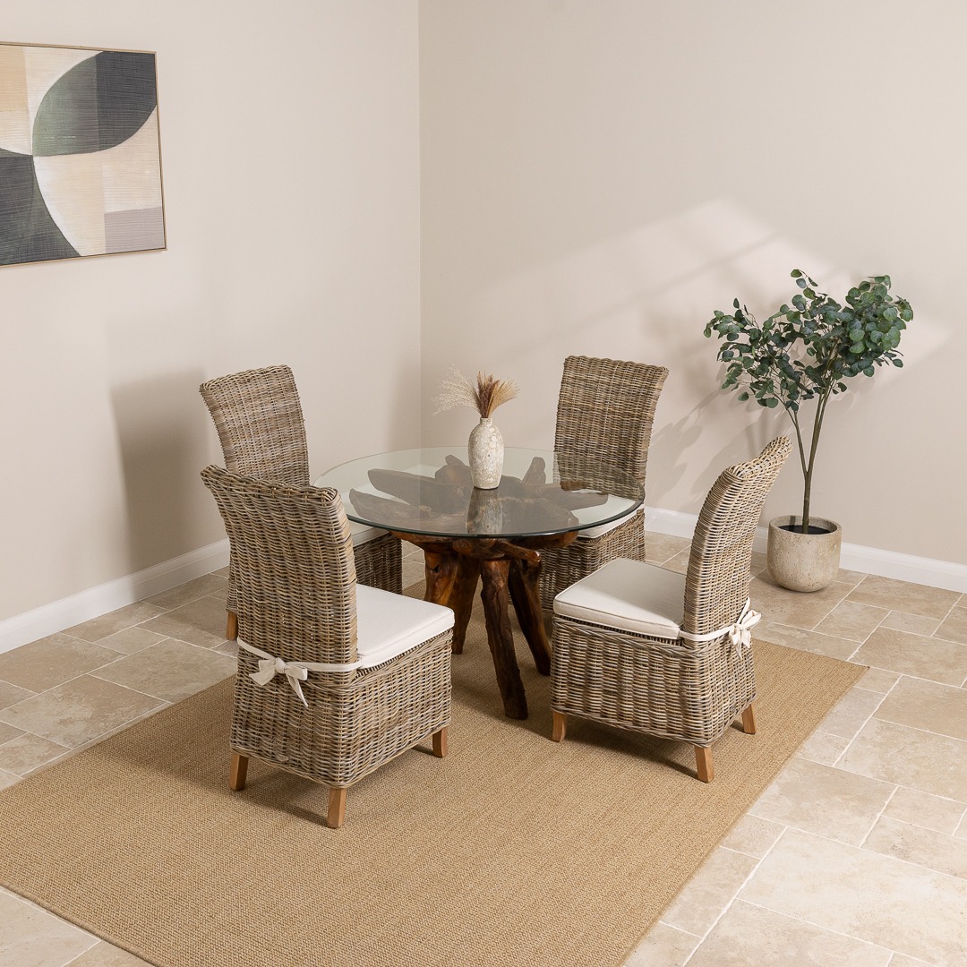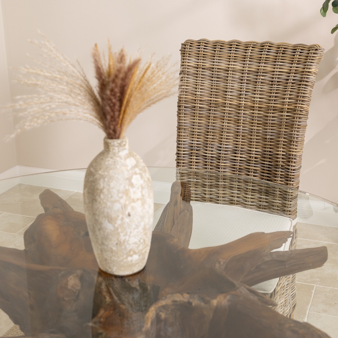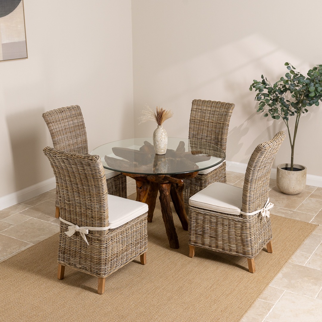 Our beautiful and striking Teak root dining tables are manufactured and handcrafted from reclaimed teak roots. Each root is completely unique including all the detailing, making this product completely bespoke and eye-catching. This table would make the perfect focal point for any room in your house. The great aspect of roots is nothing is wasted and it creates space for new teak trees to be planted, making it one of our most sustainable products out there. The roots have been excavated out of the ground from The National Indonesian Eco Programme which encourages regrowth of forests and promotes sustainable livelihoods for local people. These tables are very similar to the ones found on BBC's Saturday Kitchen television show on Saturday mornings. This root would comfortably seat 4 people and is paired with our popular Latifa Chairs. Made from Kubu Wicker they are extremely robust and stable. Each chair comes with a cushion in natural linen.