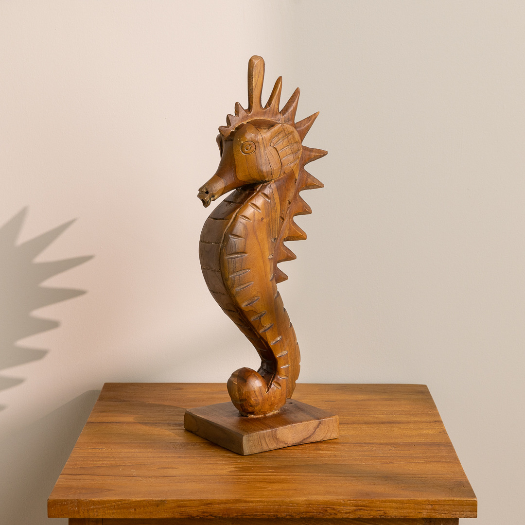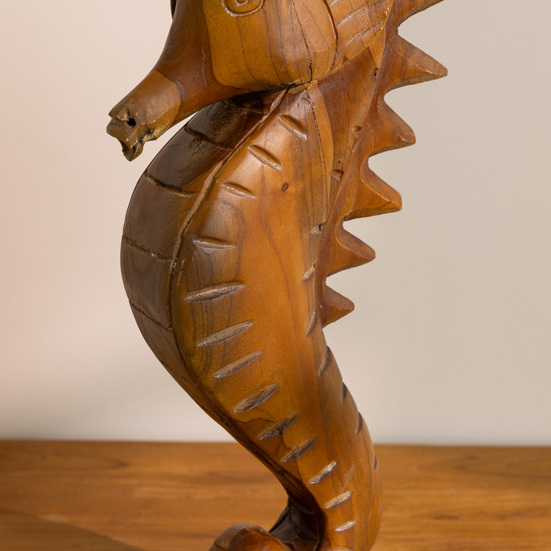 Beautiful artistic Seahorse sculpture, intricately hand-carved from reclaimed teak timber. Each charming sculpture will have unique variations due to the individual artistic carving and finishing.