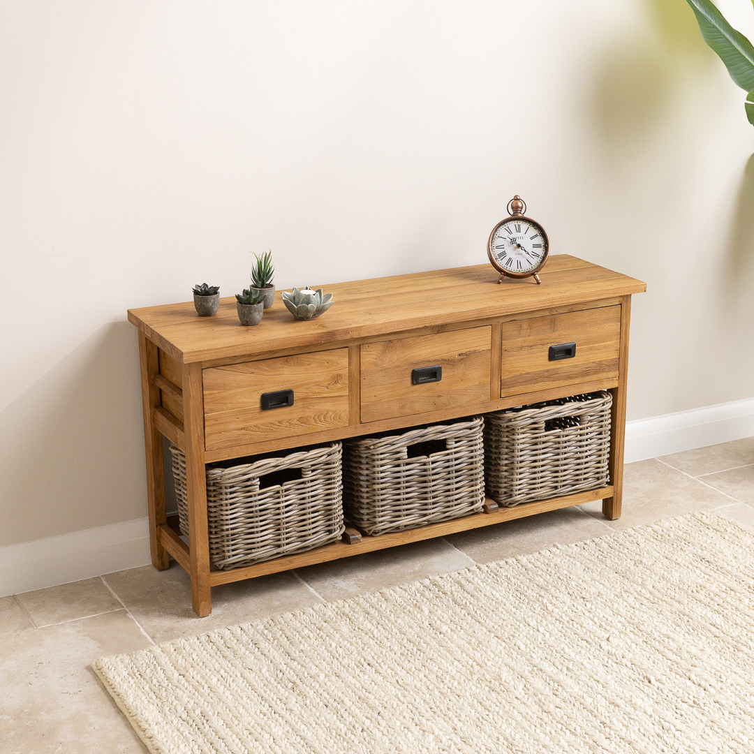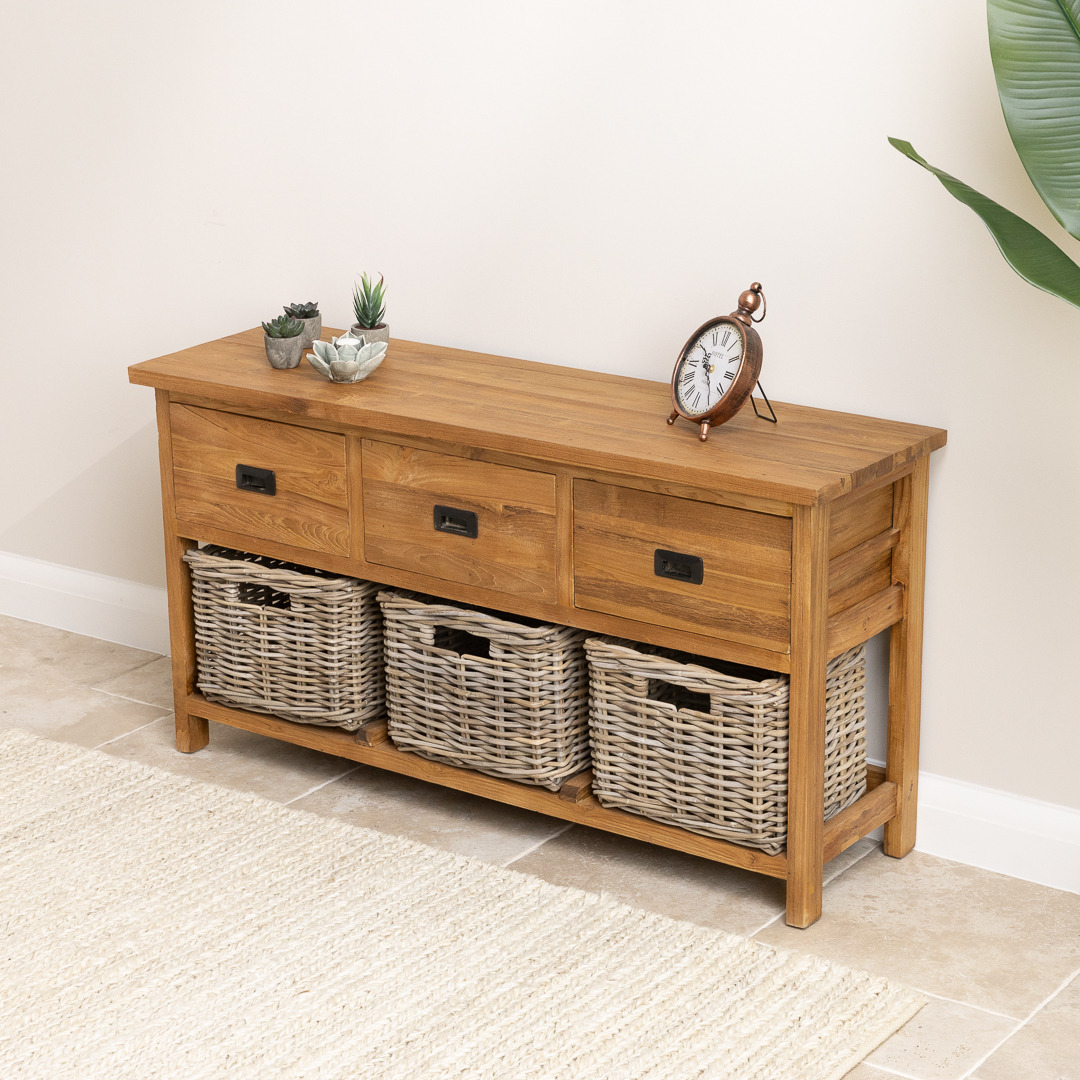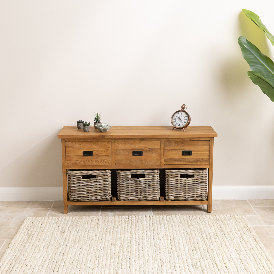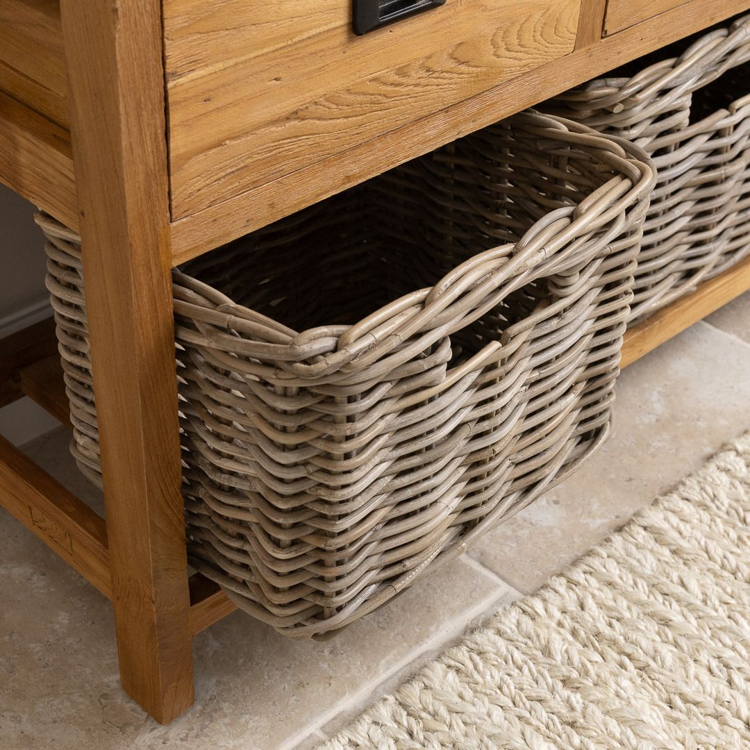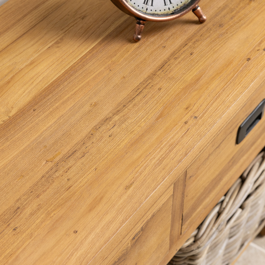 Our stunning reclaimed teak storage unit is an elegant addition to your hallway, dining room or any other area of the house where you require an attractive yet very functional piece of furniture. Made from solid reclaimed Teak using traditional joinery methods and with a rustic hand-sanded finish. The natural Kubu wicker baskets sit very comfortably beneath the large drawers.