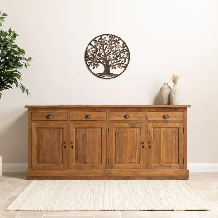 Our 4 drawer reclaimed teak dresser is absolutely stunning and will definitely give any household many years of happiness as it has been manufactured from re-afforested legally logged woodland, finally creating a truly chunky and sustainable piece of furniture by using traditional joinery methods with a fine hand-sanded finish. The 4 drawers are great for storing cutlery, placemats or other household objects, the lockable cabinets are also a great feature of this wonderful dresser it enables you to lock away important documents or even your favourite treats when willpower is not a strong point. The overall appearance of the teak dresser is well-built and very rustic which gives warmth and adds an in-depth colour to the grain of the wood.
