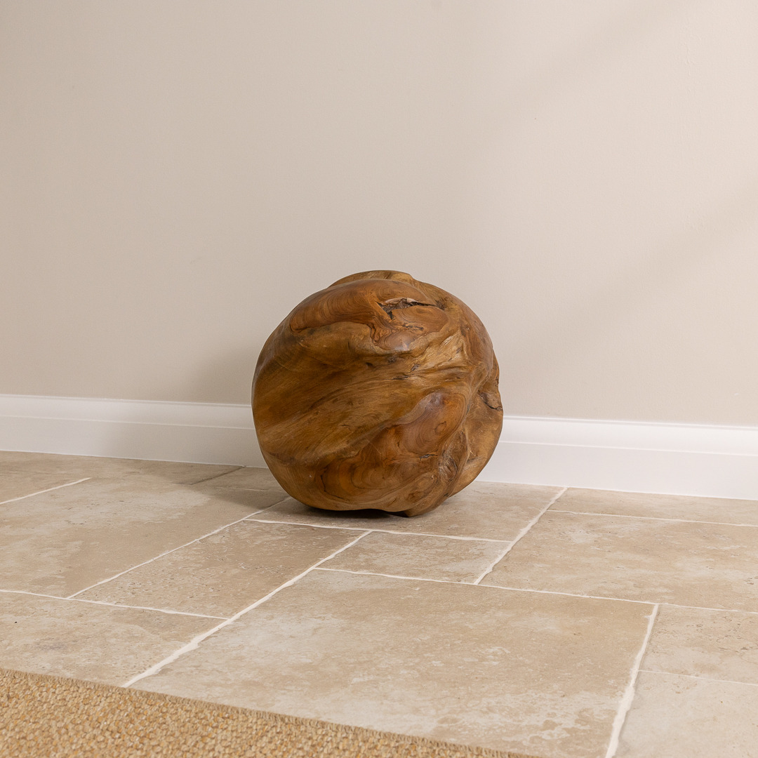 Our Solid teak root ball has been manufactured from redundant teak roots excavated from trees that have been cut down for many years. These fantastic artefacts start their story underground rendering the redundant forest useless for further cultivation as the ground is riddled with roots and completely impossible for plantation until cleared. Once extracted these huge pieces of timber are used to make furniture and artefacts and the ground is conveniently rotated and the soil rich for further plantation of young trees. A truly solid artefact that boasts a contemporary finish with a wax coating - this is a magnificent piece suitable for indoor or outdoor use, whilst each piece is completely different.