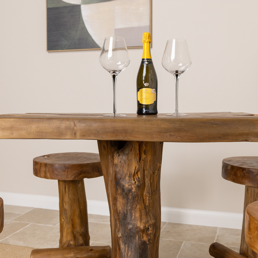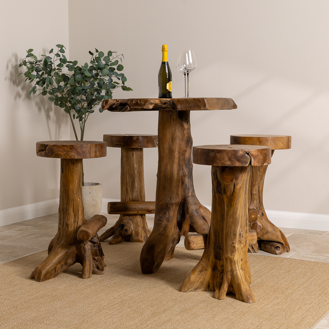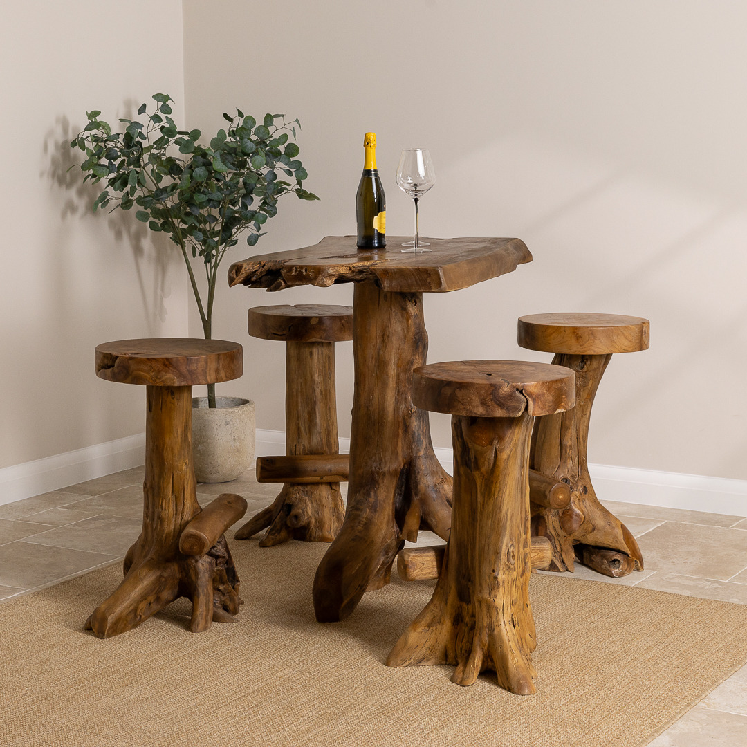 Our most unique bar table with stools will bring a bit of the outdoors into your home! Made from solid teak roots and carved into a beautiful piece of art this set is completely solid, stunning and sustainable. By buying this dining set you are helping to support sustainable foresting. The teak roots used to make this table and stool set have been excavated from the ground to encourage future plantation and regrowth. Using every bit of the tree ensures that there is no waste - smaller fragments of root are even turned into beautiful vases, mirrors and bowls. Make a statement about your style and sustainable ethos with this one-of-a-kind stunning rustic piece!