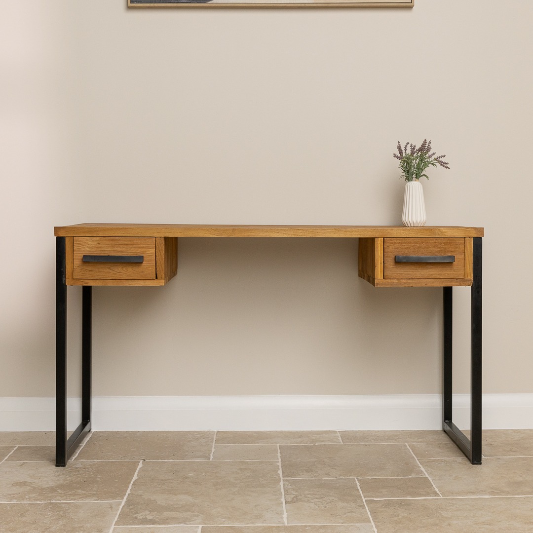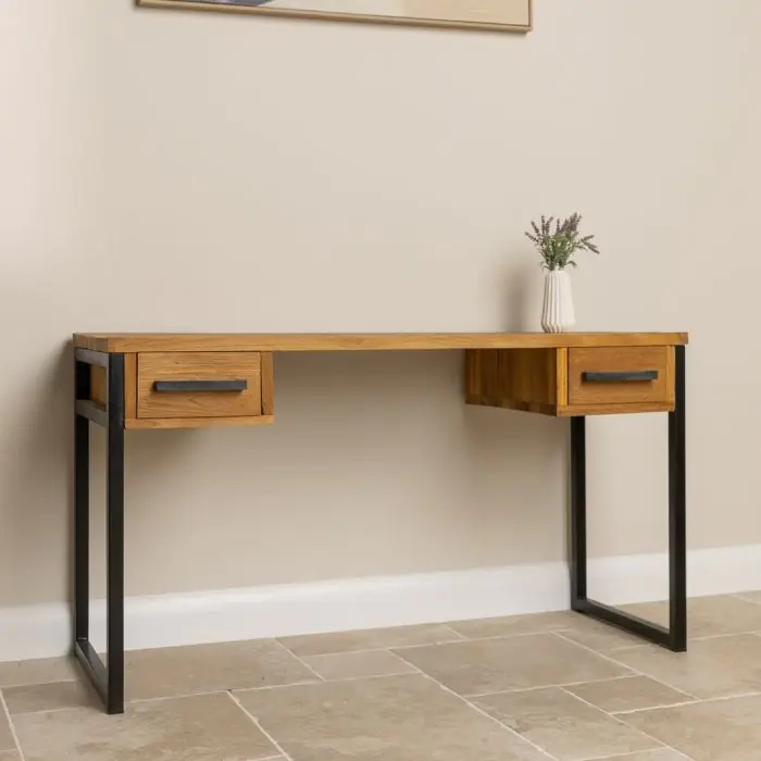 Our Urban Fusion range will inspire you to kit out your home with its chic and stylish modern living vibe. Make a statement with our Urban Fusion Desk paired with two deep suspended slimline drawers to hold all your necessary stationary needs. The overall appearance of the Urban Fusion Desk is very rustic and has an earthy tone to the reclaimed teak that shows the grain of the wood really well, whilst the iron trimmings around the wood add an edgy big city loft vibe. Manufactured from Reclaimed Teak and iron that has been handcrafted by traditional joinery methods to create an absolutely stunning and durable piece of furniture.