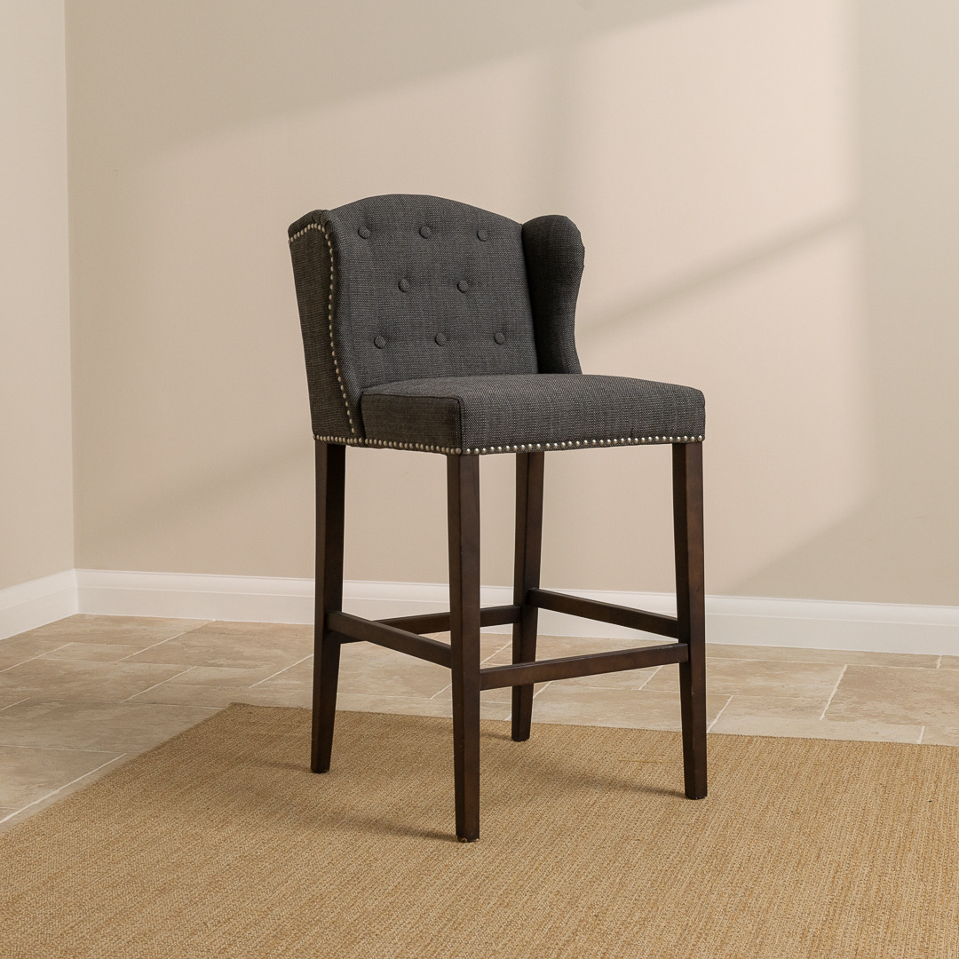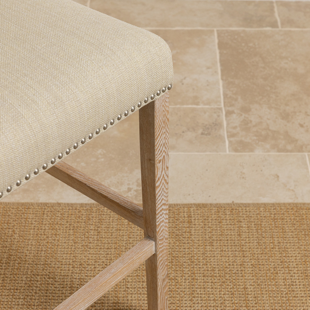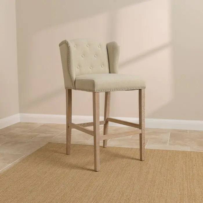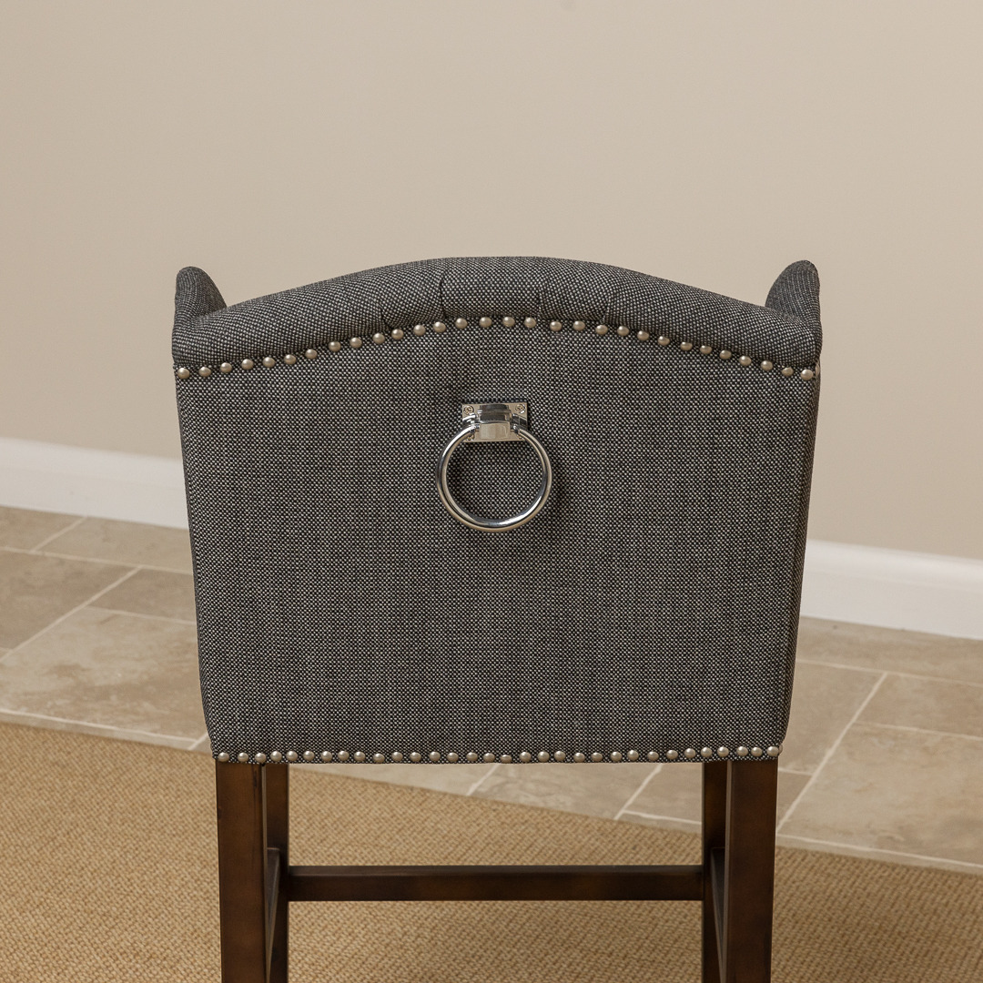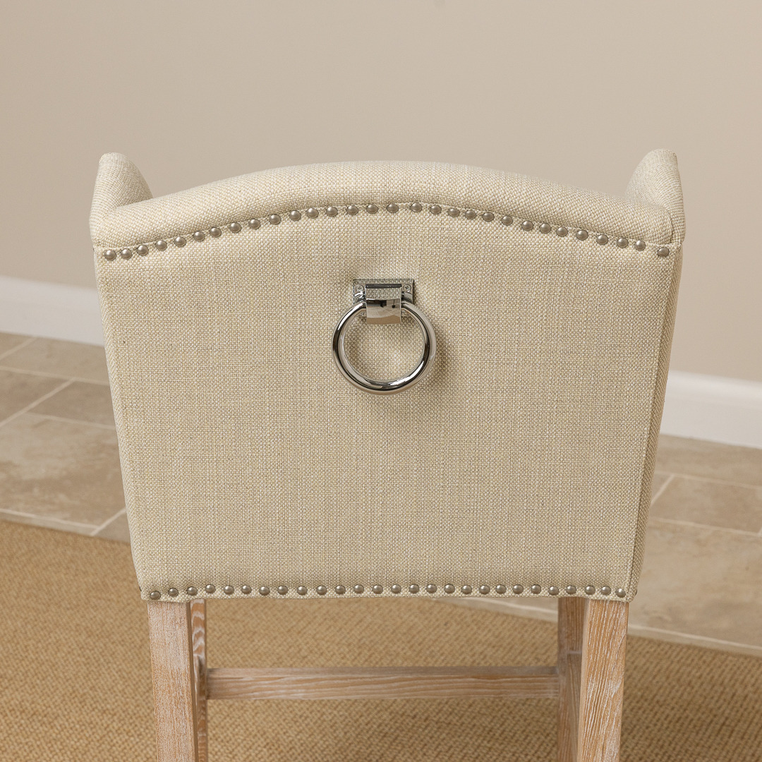 The Windsor Ring Back bar stool has been added to our collection of luxurious and sophisticated upholstered dining range. This stunning bar stool was designed by Margaret, our Managing Director, to complement the grey Windsor ring back chairs. Many of us now have dining and kitchen areas floating into one, which led us to think that our customers would love to have barstools to match their dining chairs. These ring-back bar stools will certainly add a beautiful, chic, furnished look to any breakfast bar. They have been expertly tailored, which shows off their pinched pleat design and deep buttoning detail. The perfectly placed chrome upholstered tacks and metal ring pull work seamlessly with this contemporary style. Comfort is also second to none, with a foam filling that also has sprung webbing to give ultimate comfort and support when you are enjoying a casual dining experience with family and friends.
